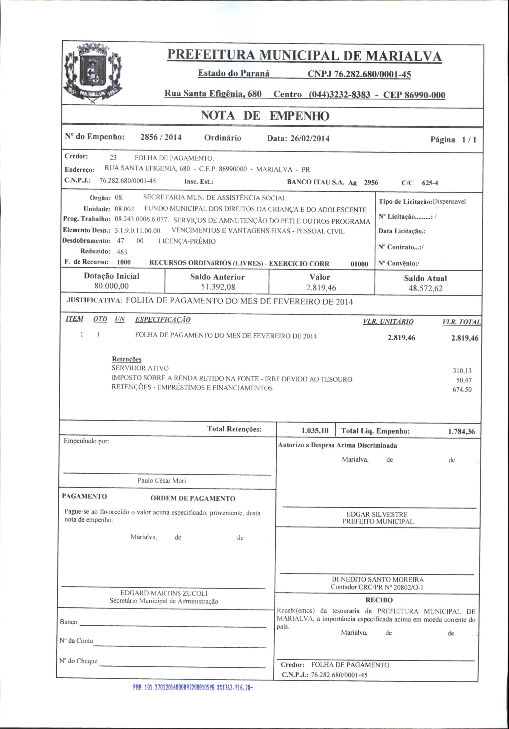 Index of /2014/FEVEREIRO/BALANCETE FEVEREIRO 2014/FOLHA DE PAGAMENTO/2856-2014